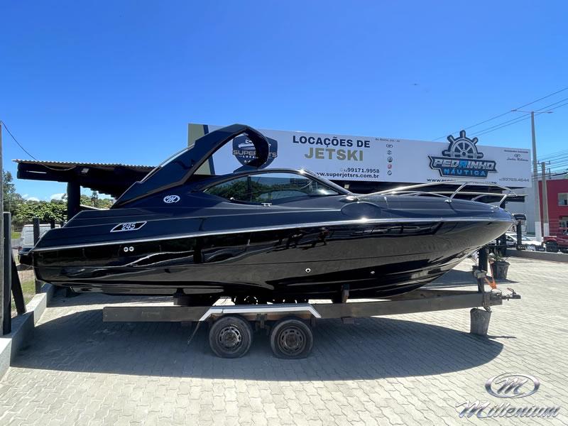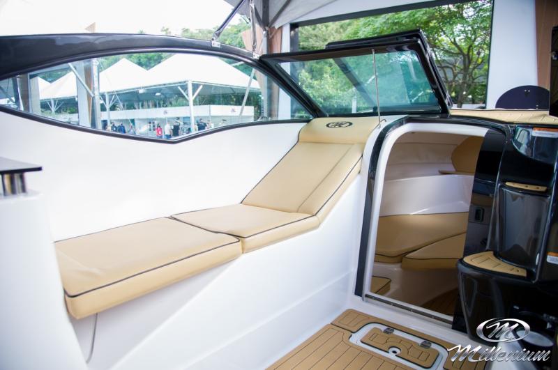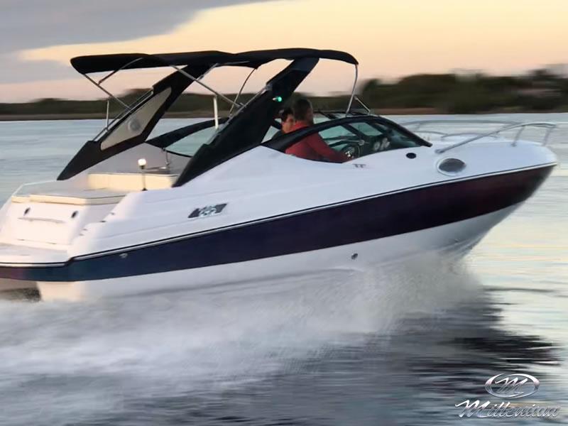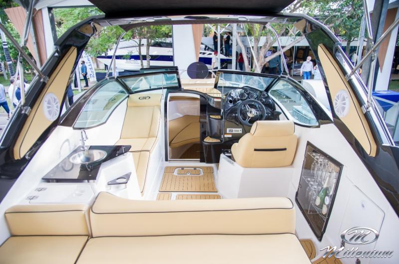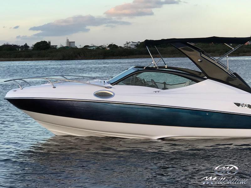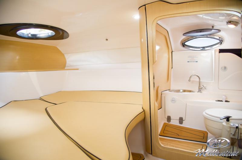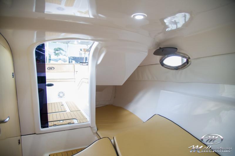 Cabine bem resolvida, Motorização de centro rabeta, Designer bonito e moderno, Excelente navegação com baixa motorização, Banheiro privativo, Casco corta bem as ondas
